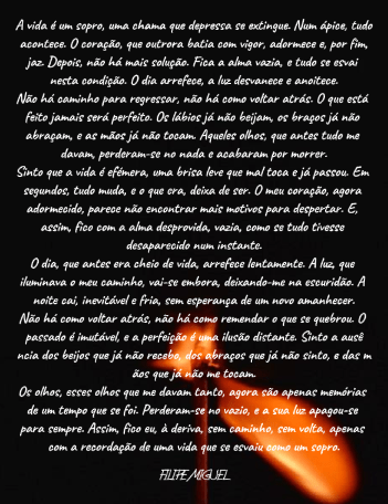 A vida é um sopro, uma chama que depressa se extingue. Num ápice, tudo acontece. O coração, que outrora batia com vigor, adormece e, por fim, jaz. Depois, não há mais solução. Fica a alma vazia, e tudo se esvai nesta condição. O dia arrefece, a luz desvanece e anoitece.