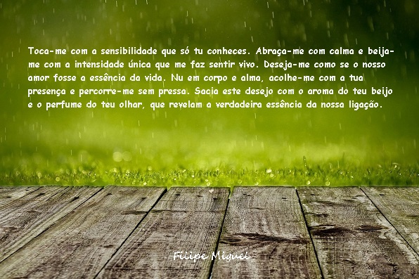 Toca-me com a delicadeza de quem compreende cada nuance do que somos juntos. Abraça-me com a força tranquila que só quem verdadeiramente ama pode dar. Beija-me com a intensidade que só tu sabes imprimir, como se cada toque fosse um poema escrito só para nós. Deseja-me, não só no instante presente, mas como se o nosso desejo fosse a própria essência do que vivemos. Ama-me, com a profundidade que faz da nossa conexão um laço Inquebrantável, que se estende além do que é visível.