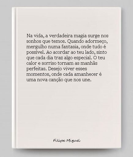 Nada se compara à magia de sonhar contigo. Acordar ao teu lado é o meu lugar favorito. Vejo-te a dormir, sinto o teu calor e isso enche-me de amor. Quero ser a primeira voz a dizer-te “bom dia”, ver-te abrir os olhos e encantar-me com o teu sorriso. A beleza da manhã, iluminada pelo sol, faz tudo parecer perfeito.