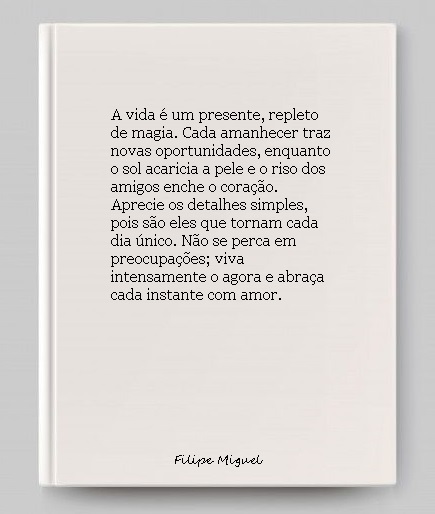 Cada dia é uma página em branco, pronta para ser escrita. Aprendemos com o passado, mas não nos deixamos prender a ele. Em vez disso, olhamos para frente, prontos para sonhar e crescer. A vida é como uma semente que plantamos: se cuidarmos dela agora, colheremos flores de alegria amanhã.