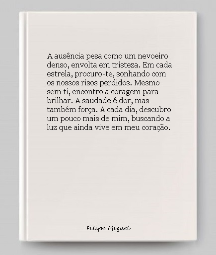 No silêncio, a falta grita alto. Cada dia sem ti é como um castigo que não tem fim. Sorriso escasso, luz ausente, e a alma envolvida por um vazio profundo. Este amor que guardo, tão distante, tornou-se um eco no meu coração.
