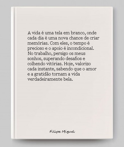 Neste momento, celebro as pessoas que amo. A vida ao seu lado é mais colorida, como uma tela em branco onde cada dia traz novas possibilidades. Juntos, criamos memórias que se entrelaçam, formando uma história rica em amor e amizade.
