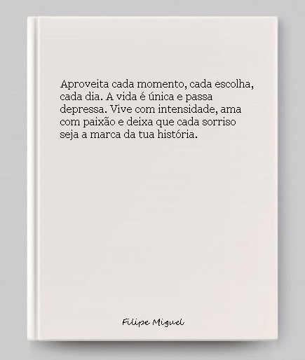 A vida é uma única chance. Não adies o que podes fazer agora. Cada escolha que tomas constrói o teu caminho. A vida é como uma tela em branco, à espera de ser preenchida com as cores da paixão, do amor e da alegria.