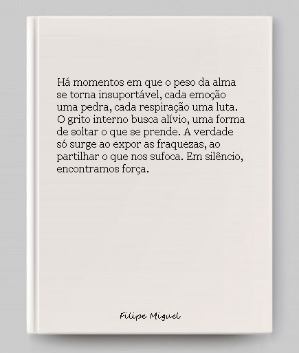 Cada palavra que sai de mim é uma parte daquilo que sou. Um pedaço da minha verdade, um pedaço da minha dor. Quero despir-me das máscaras que uso todos os dias, libertar-me do que me prende, para ser eu, sem medo, sem limites.