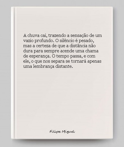 Olho pela janela e vejo a chuva a cair lá fora. Cada gota parece ser tua, uma lágrima que escorre sem fim. O som das gotas no vidro é como um suspiro, uma lembrança da tua ausência que me aperta o peito. Sinto-me vazio, como se a dor se tivesse instalado em mim, dificultando até a respiração. A saudade é um peso enorme que me impede de seguir, mas sei que preciso resistir.