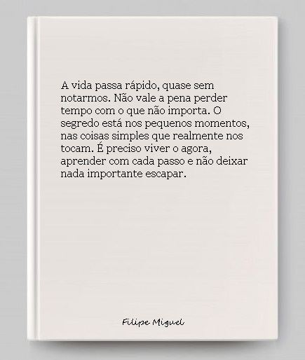 A vida passa rápido, mais rápido do que pensamos. Não vale a pena perder tempo com o que não importa. A vida é curta, tão curta, que é quase um desperdício não a viver plenamente, não a abraçar com todo o teu ser.