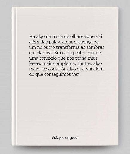 O teu olhar é o reflexo do que sou, e, ao mesmo tempo, aquilo que quero ser. Quando os nossos olhos se cruzam, sinto-me seguro. Não há máscaras, não há inseguranças. Só nós, naquele abraço que me acalma e faz-me sentir em casa. A tua presença faz o mundo lá fora desaparecer.