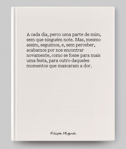 Ao tentar resolver a situação, percebo que tudo isso representa a minha angústia. Por mais que me esforce para entender, sei que nunca conseguirei completamente. É como se algo estivesse preso dentro de mim, bem no fundo do coração, e a cada dia que passa, sinto que estou a morrer um pouco mais. A cada dia, perco uma parte de mim, sem que ninguém note. Mas, mesmo assim, seguimos, e, sem perceber, acabamos por nos encontrar novamente, como se fosse para mais uma festa, para outro daqueles momentos que mascaram a dor.