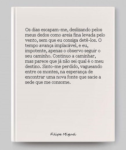 Os dias escapam-me, deslizando pelos meus dedos como areia fina levada pelo vento, sem que eu consiga detê-los. O tempo avança implacável, e eu, impotente, apenas o observo a seguir o seu caminho. Continuo a caminhar, mas parece que já não sei qual é o meu destino. Sinto-me perdido, vagueando entre os montes, na esperança de encontrar uma nova fonte que sacie a sede que me consome. A fome já a matei, lançando a rede nas águas serenas do rio. Contudo, a dor persiste, e o frio gela-me a alma.