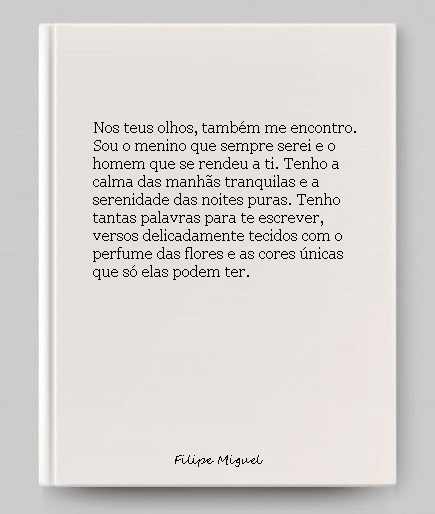 Nos teus olhos, também me encontro. Sou o menino que sempre serei e o homem que se rendeu a ti. Tenho a calma das manhãs tranquilas e a serenidade das noites puras. Tenho tantas palavras para te escrever, versos delicadamente tecidos com o perfume das flores e as cores únicas que só elas podem ter.