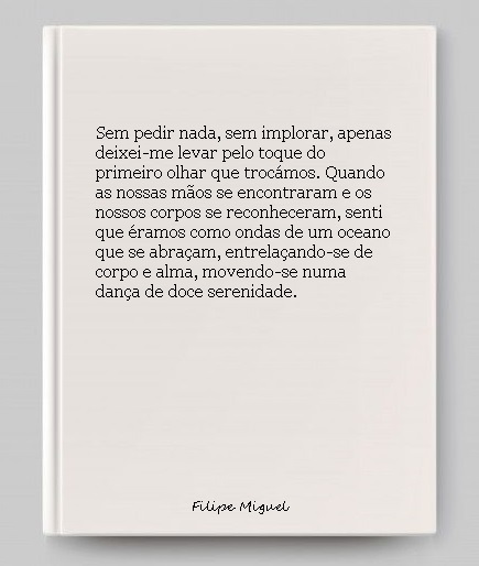 Quando as nossas mãos se encontraram e os nossos corpos se reconheceram, senti que éramos como ondas de um oceano que se abraçam, entrelaçando-se de corpo e alma, movendo-se numa dança de doce serenidade, naquele momento supremo.
