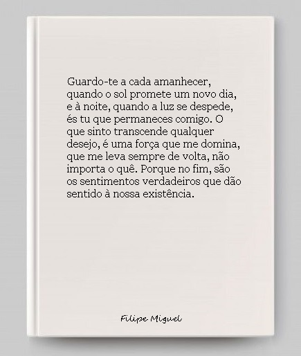 Guardo-te profundamente dentro de mim, como se cada batida do meu coração fosse um lembrete constante da tua presença. Não és apenas uma lembrança, és o bater que mantém vivo este corpo onde todas as emoções se entrelaçam. Sinto-te junto ao meu peito, onde renasces a cada respiração, em cada batimento. Guardo-te como a suavidade de uma brisa marinha que me envolve por completo. Nesse oceano, perco-me em ti, dominado por uma corrente de sentimentos indomáveis. Os teus beijos são como um néctar doce, viciante, que me deixa ansiando sempre por mais. Com a tua presença, sacias esta fome de amor, preenchendo cada vazio em mim. Sinto-te na palma da minha mão, no calor do meu toque, no eco do meu riso e até nas notas de uma canção que me acompanha a cada momento. É tão reconfortante ter-te aqui, sentir-te em cada parte de mim. Guardar-te é um privilégio, pois a tua existência dá sentido à minha. Guardo-te a cada amanhecer, quando o sol promete um novo dia, e à noite, quando a luz se despede, és tu que permaneces comigo. O que sinto por ti transcende qualquer desejo, é uma força que me domina, que me leva sempre de volta a ti, não importa o quê. Vou guardar-te para sempre. Que esse para sempre se estenda pela eternidade, porque ter-te comigo é a única verdade que desejo carregar. Serás sempre a minha certeza, o meu refúgio, o meu tudo.