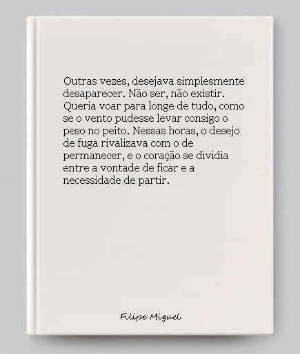 Mas outras vezes, desejava simplesmente desaparecer. Não ser, não existir. Queria voar para longe de tudo, como se o vento pudesse levar consigo o peso no peito. Nessas horas, o desejo de fuga rivalizava com o de permanecer, e o coração se dividia entre a vontade de ficar e a necessidade de partir.
