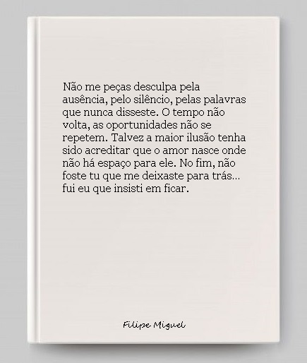 Não me peças desculpa pelo carinho que nunca recebi, pelos momentos que deixei de viver sozinho, a contar as horas e os instantes, ansiando por ti. As cartas que te escrevi, cheias de promessas e desejos, e as tuas que nunca recebi, são páginas em branco, como as noites em que olhei para o teto, esperando que algo mudasse.