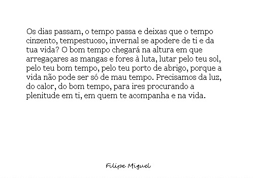 Os dias passam, o tempo passa e deixas que o tempo cinzento, tempestuoso, invernal se apodere de ti da tua vida? O bom tempo chegará na altura que arregaçares as mangas e fores à luta, lutar pelo teu sol, pelo teu bom tempo, pelo teu porto de abrigo, porque a vida não pode ser só de mau tempo, precisamos da luz, do calor, do bom tempo, para ires procurando a plenitude em ti, em quem te acompanha e na vida.