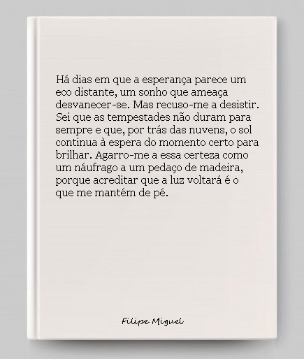 Há dias em que a esperança parece um eco distante, um sonho que ameaça desvanecer-se. Mas recuso-me a desistir. Sei que as tempestades não duram para sempre e que, por trás das nuvens, o sol continua à espera do momento certo para brilhar. Agarro-me a essa certeza como um náufrago a um pedaço de madeira, porque acreditar que a luz voltará é o que me mantém de pé.