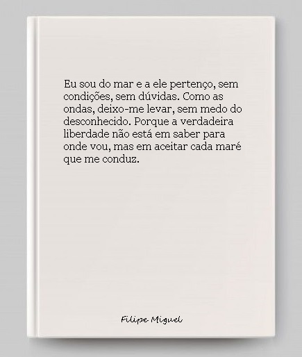 Eu sou do mar. É nele que encontro o meu refúgio, o meu verdadeiro lar. As minhas raízes entrelaçam-se com as ondas, e ao oceano pertenço como parte inseparável da sua essência. Sou o reflexo no teu olhar, a lágrima silenciosa que desliza e encontra descanso num lenço esquecido. Sou a onda persistente que atravessa o imenso oceano apenas para tocar os teus pés, num instante breve, mas eterno.