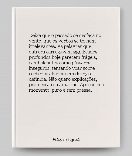 Deixa que o passado se desfaça no vento, que os verbos se tornem irrelevantes. As palavras que outrora carregavam significados profundos hoje parecem frágeis, cambaleantes como pássaros inseguros, tentando voar sobre rochedos afiados sem direção definida. Não quero explicações, promessas ou amarras. Apenas este momento, puro e sem pressa.