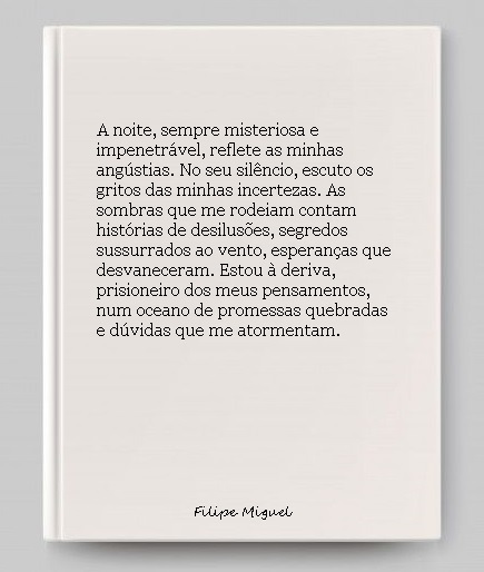 A noite, sempre misteriosa e impenetrável, reflete as minhas angústias. No seu silêncio, escuto os gritos das minhas incertezas. As sombras que me rodeiam contam histórias de desilusões, segredos sussurrados ao vento, esperanças que desvaneceram. Estou à deriva, prisioneiro dos meus pensamentos, num oceano de promessas quebradas e dúvidas que me atormentam.