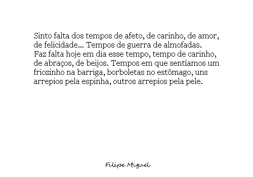 Faz falta hoje em dia esse tempo, tempo de carinho, de abraços, de beijos. Tempos em que sentíamos um friozinho na barriga, borboletas no estômago, uns arrepios pela espinha, outros arrepios pela pele.