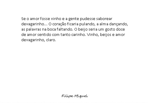E se o amor fosse vinho e a gente pudesse saborear devagarinho? O coração ficaria pulando, a alma dançando, as palavras na boca faltando. O beijo seria um gosto doce de amor sentido com tanto carinho. Vinho, beijos e amor devagarinho, claro.