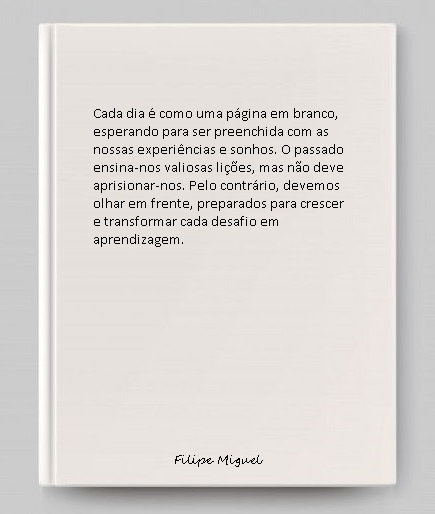 Cada dia é como uma página em branco, esperando para ser preenchida com as nossas experiências e sonhos. O passado ensina-nos valiosas lições, mas não deve aprisionar-nos. Pelo contrário, devemos olhar em frente, preparados para crescer e transformar cada desafio em aprendizagem. A vida é como uma semente: se a cultivarmos com dedicação e carinho, colheremos flores de felicidade no futuro.