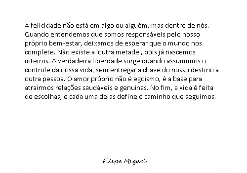 A felicidade existe e está dentro de nós e não fora, não podemos depositar na outra pessoa a nossa felicidade, temos que ter amor próprio, só assim teremos paz e felicidade, ninguém completa ninguém, se não tivermos amor próprio. Não existe a outra metade, enquanto não nos aceitamos como somos. Nós nascemos inteiros, não é egoísmo, só vamos atrair um grande amor quando estivermos de bem com nós mesmos.