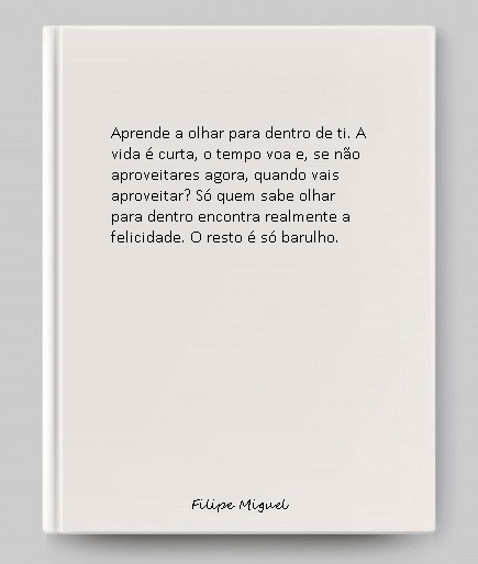 A vida passa a correr e, muitas vezes, esquecemo-nos de olhar para dentro. Vivemos sempre a correr atrás do que está fora, sem perceber que o mais importante está bem à nossa frente, dentro de nós. O tempo é precioso, a vida é um piscar de olhos, e a felicidade só chega a quem sabe olhar para dentro e viver o presente.