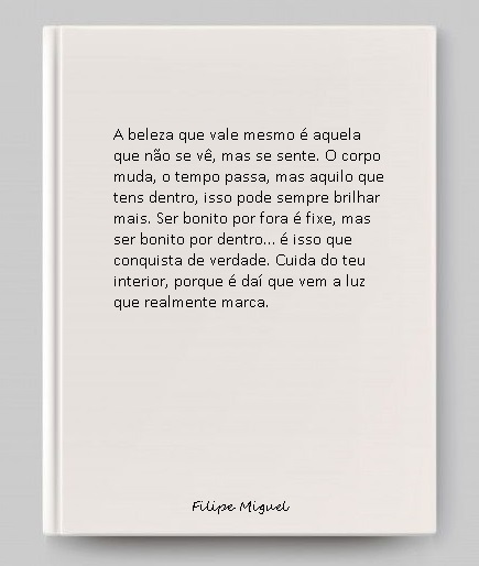 Vivemos numa era em que se valoriza mais o que se vê do que o que se sente. Mas diz-me lá: de que serve ter um corpo de capa de revista, se por dentro falta tudo o que importa? A beleza exterior pode chamar a atenção, mas é a beleza interior que fica, que toca, que marca. Um rosto bonito atrai olhares, mas é a alma que conquista corações.
