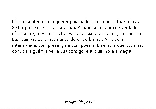 Eu não quero a Lua. Eu necessito dela, para poder sonhar a imensidão de um amor oculto e com as suas fases! Também o amor tem amor novo, amor cheio, amor crescente e amor minguante. Ou o seu inverso.