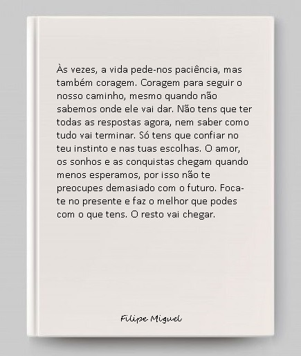 O amor não tem regras, mas para que aconteça, temos de ser nós mesmos, o que, por vezes, é difícil. Mas, por amor, vale a pena tentar. Não deixem de acreditar no amor! Lutem pelo que querem e tomem o destino nas vossas mãos. Nunca é tarde para amar e sonhar. E não liguem ao que os outros dizem. As pessoas às vezes falam sem pensar.