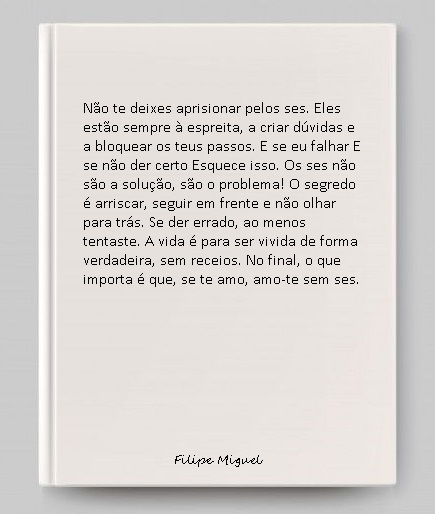 Os “ses” só nos roubam momentos preciosos. Quanto mais nos deixamos levar por eles, mais indecisos e infelizes nos tornamos. Para ser feliz, é preciso afastar os “ses”. No amor, na amizade, na felicidade… a equação não tem “ses”. Se te amo, amo-te, e é só isso!
