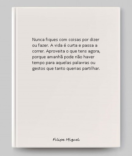 Nunca deixes nada por dizer, nem por fazer. A vida passa num piscar de olhos e, quando damos por isso, já foi. Hoje estamos aqui, amanhã já ninguém sabe. E o que ficou por dizer? E o que ficou por viver? Guarda menos e vive mais.