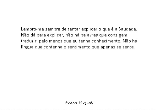 Lembro-me sempre de tentar explicar o que é a Saudade. Não dá para explicar, não há palavras que consigam traduzir, pelo menos que eu tenha conhecimento. Eu não tnho palavras expliquem, que traduzem, nem traduzir noutras línguas.