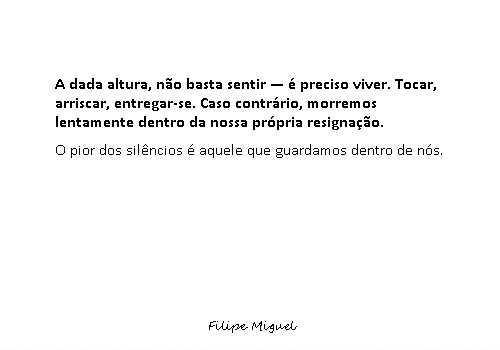 Apetece-me subir acima das nuvens, perder o controlo e tocar-te. Passar do sonho à realidade! Uma carícia lenta e um beijo longo. Começar de novo, deixar tudo para trás e investir num novo amor, sem calculismos, falsos moralismos, ou o que quer que seja! A dada altura, não basta o amor, é preciso personificá-lo e fisicamente desenvolvê-lo, sob pena de morrermos de tédio e de tristeza, dentro da cobardia da nossa auto-resignação. Não pensem, concretizem, sempre em nome do amor e da verdade! Aí perceberão quanto foi boa a mudança! Tenham sempre isto na lembrança!