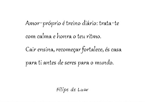 Amor‑próprio é olhar para as tuas falhas sem te destruíres. É aceitar que tropeças, que duvidas, que te perdes, mas que continuas. É perceber que crescer dói, mas também ilumina. Que cada queda te ensina, cada recomeço te afina, cada silêncio te aproxima de ti.